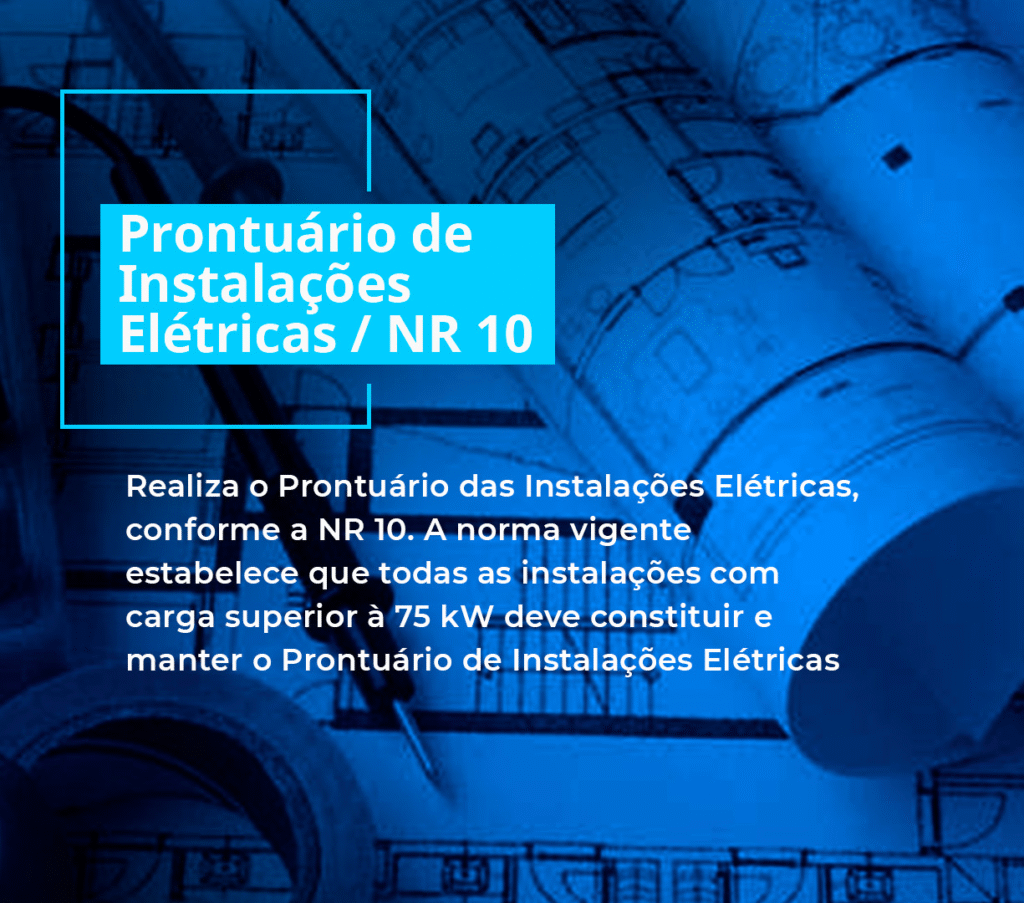 Realizamos o Prontuário das Instalações Elétricas, conforme a NR 10. A norma vigente estabelece que todas as instalações com carga superior à 75 kW deve constituir e manter o Prontuário de Instalações Elétricas, ou seja, precisam preparar um conjunto de documentos, diagramas unifilares e procedimentos que devem ser dispostos organizadamente.